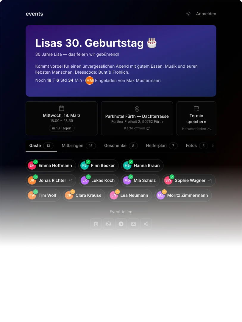 Teile den Event-Link per WhatsApp, E-Mail oder den QR-Code mit deinen Gästen.