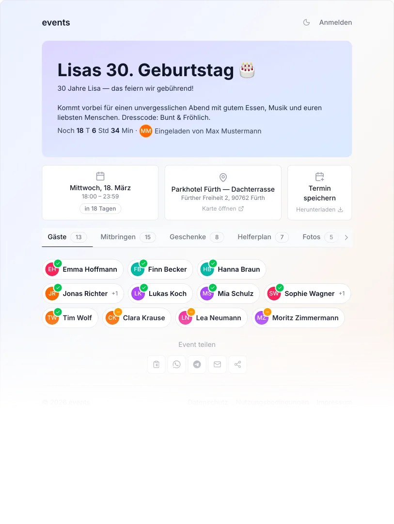 events organisiert Zusagen, Mitbring-Listen, Fahrgemeinschaften und Fotos — an einem Ort. Deine Gäste brauchen keinen Account.